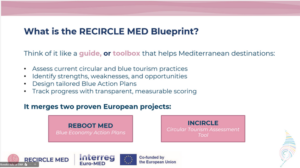 Following a welcome by the University of Thessaly (Greece), associated partners had the opportunity to explore the RECIRCLE MED Blueprint for Blue Action Plans for Circular Tourism, presented by the Energy and Water Agency (Malta).